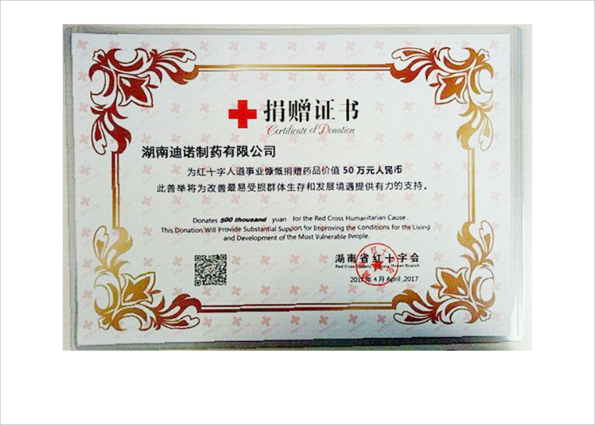 红十字会50万药品捐赠证书